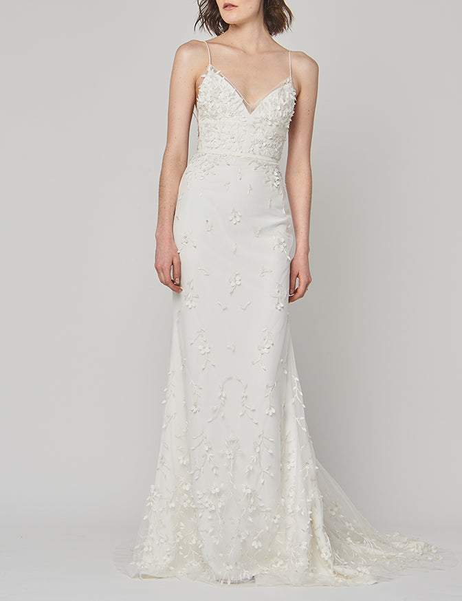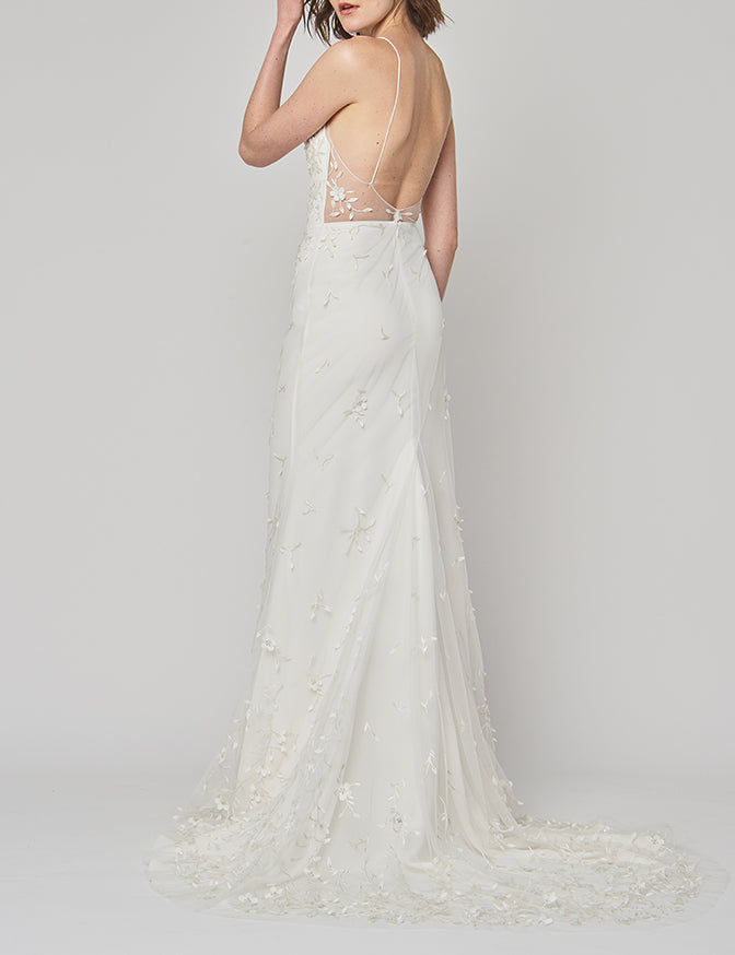 The Alexandra Grecco Billie Gown is the perfect combination of sexy & sweet. Billie features a low scoop back and long train, adding just enough drama to this modern, fitted gown. If you are looking for a subtle, yet show stopping gown, look no further than Billie. Available in Off White.